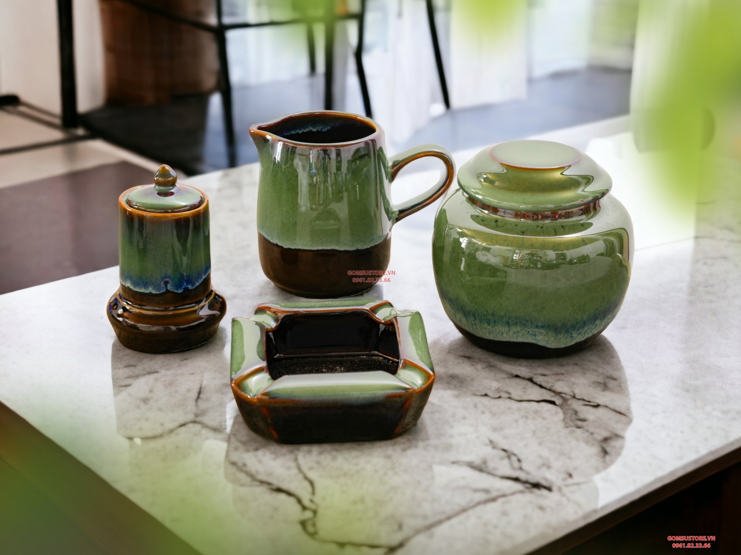 ● Sản phẩm: Bộ ấm chén men hoả biến xanh đá, gốm Bát Tràng cao cấp.