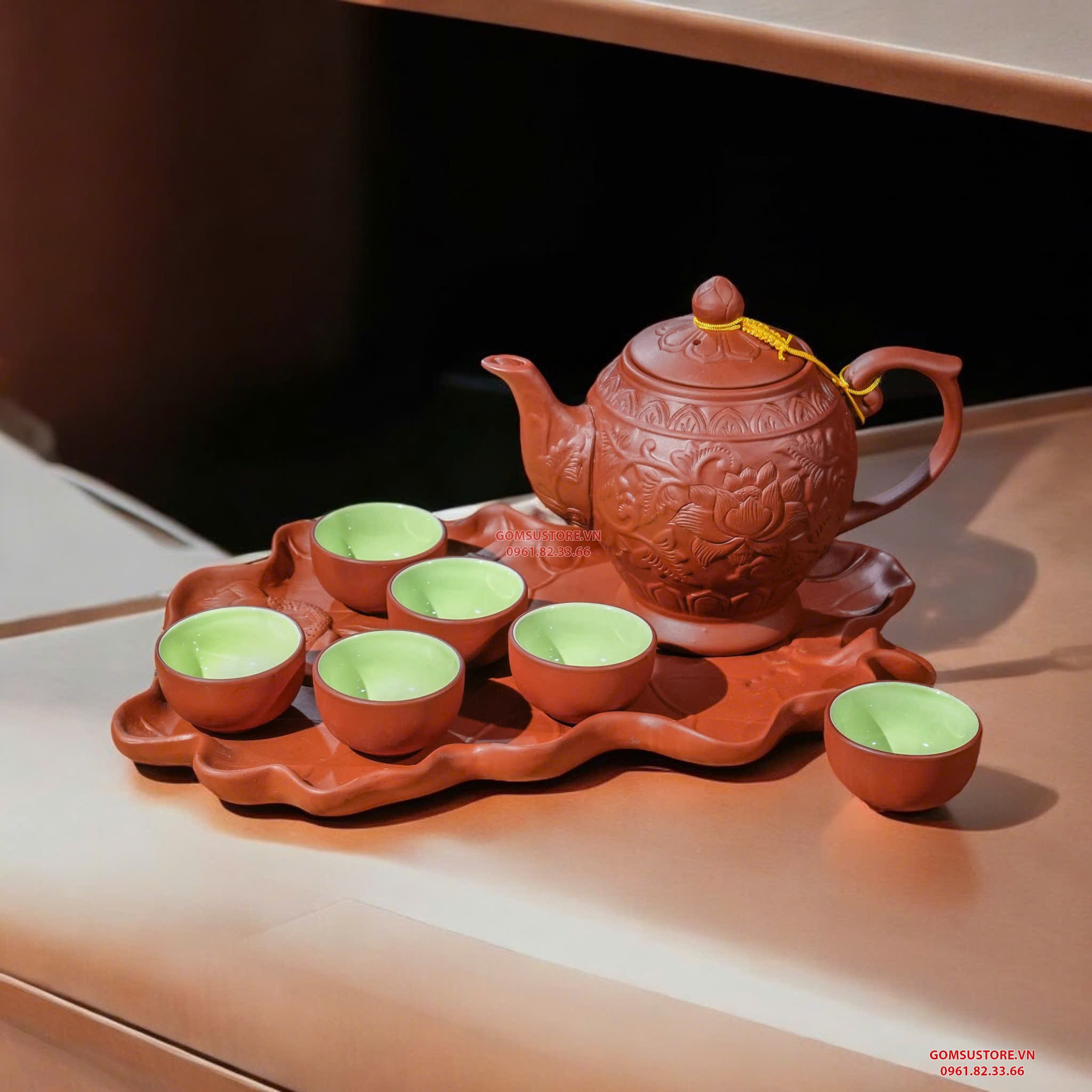 Bộ Ấm Chén Tử Sa Đèn Cao là lựa chọn hoàn hảo cho những ai yêu thích sự tinh tế và nghệ thuật trà đạo truyền thống. Được chế tác từ đất tử sa đặc trưng của Bát Tràng, sản phẩm mang vẻ đẹp mộc mạc nhưng đầy chiều sâu, kết hợp giữa sắc đỏ đen sang trọng và họa tiết chạm khắc tinh xảo, tạo nên một tổng thể hài hòa và đẳng cấp.