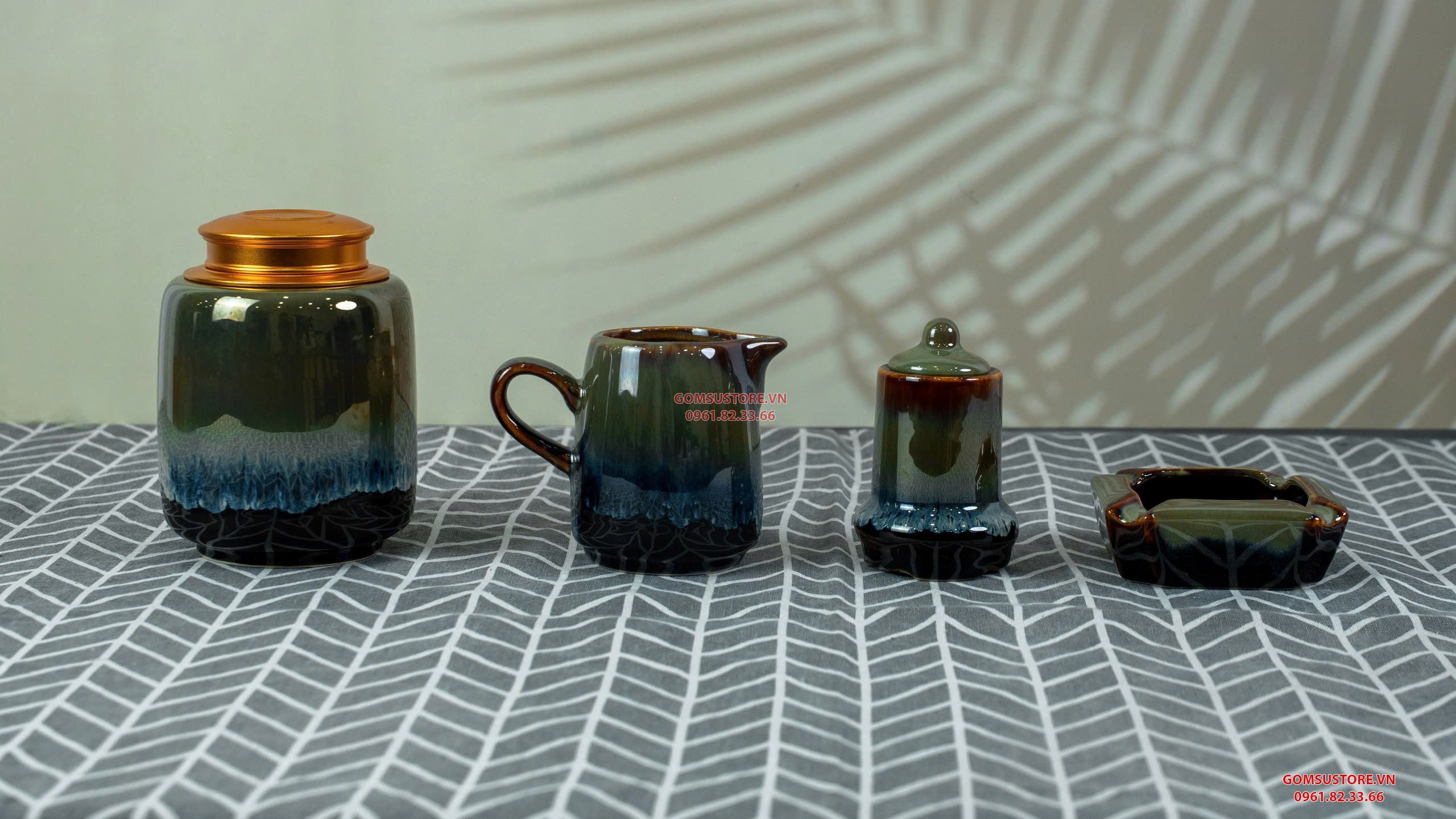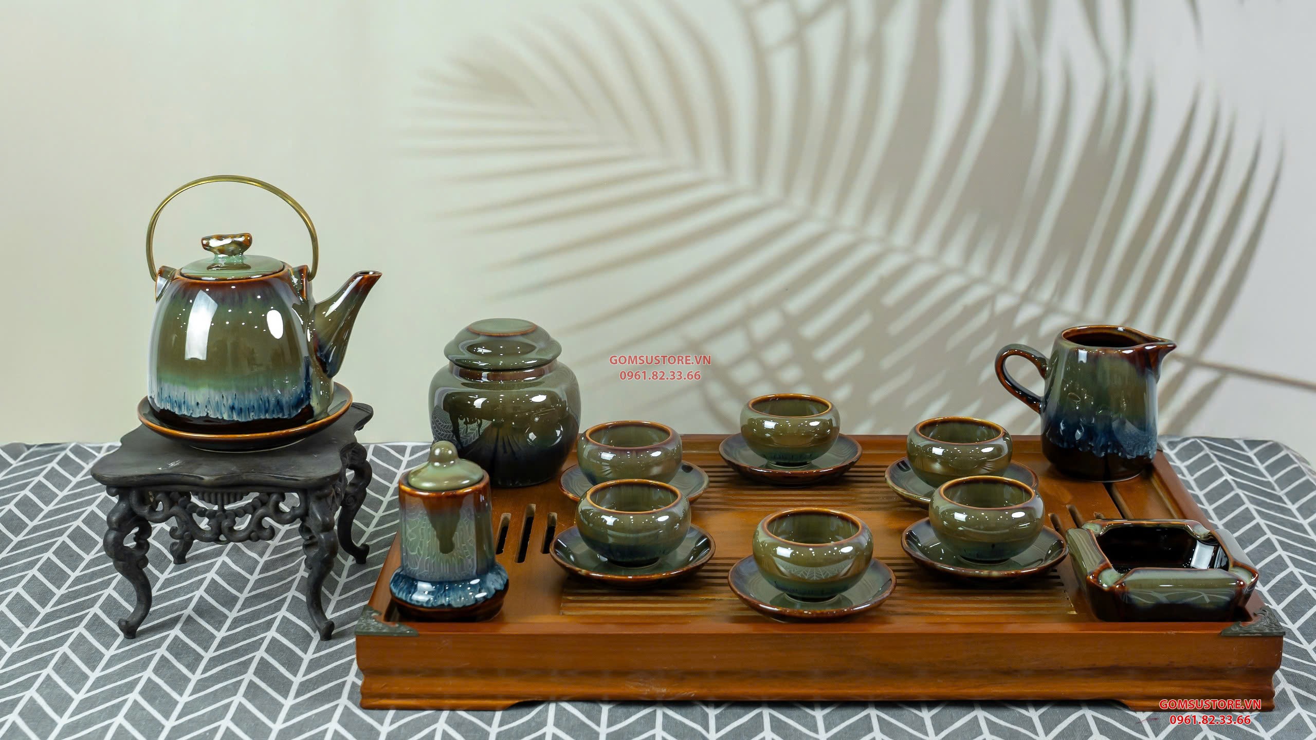 Bộ sản phẩm gồm 1 ấm, 6 chén và 7 đĩa kê, được làm thủ công tại Bát Tràng với công nghệ nung hỏa biến hiện đại tạo hiệu ứng men gương độc đáo. Sắc xanh lục kết hợp cùng viền nâu tạo nên vẻ đẹp mộc mạc, sang trọng, phù hợp dùng làm quà tặng, trưng bày hoặc sử dụng hàng ngày.