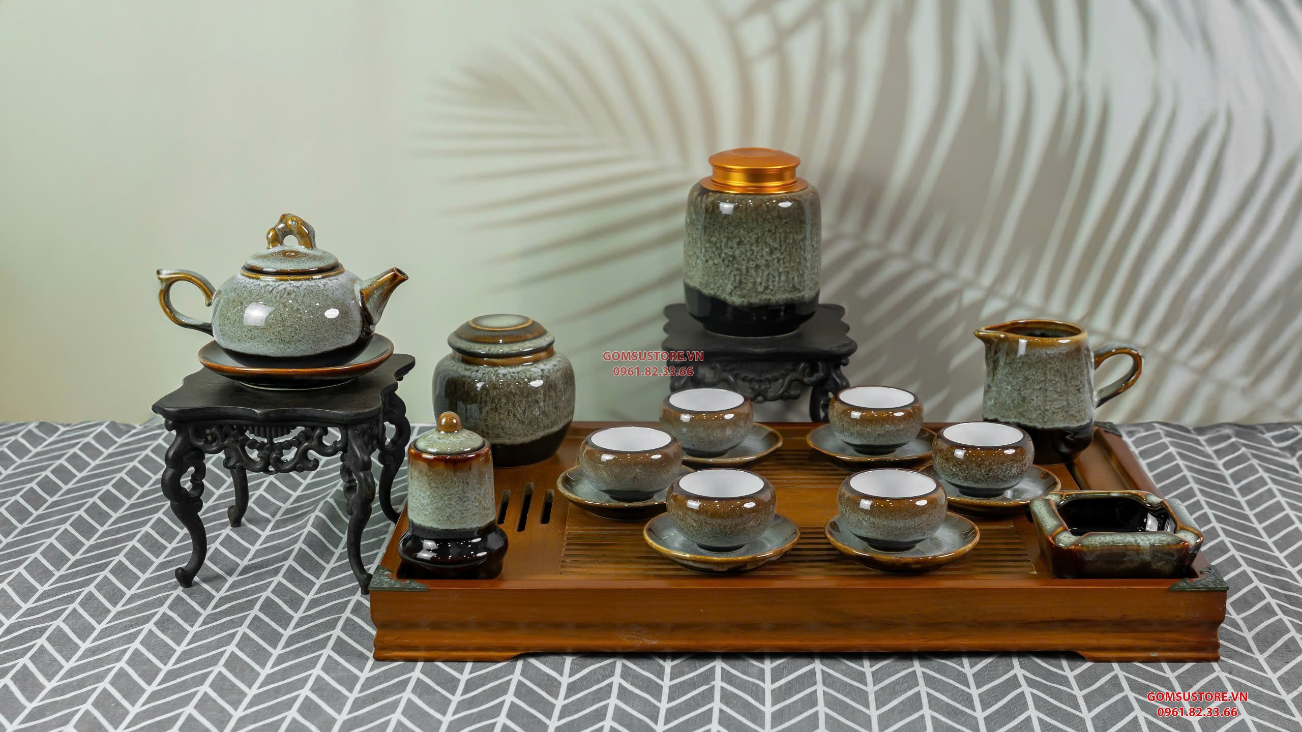 Bộ sản phẩm gồm 1 ấm, 6 chén và 7 đĩa kê, được làm hoàn toàn thủ công tại Bát Tràng với men tuyết (men trắng vân nứt khéo léo) tạo hiệu ứng tuyết rơi sang trọng và độc đáo: