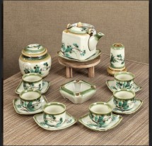 Ấm chén + 4 phụ kiện bao gồm: 1 ấm, 6 chén, 7 đĩa kê, 1 hộp chè, 1 gạc tàn, 1 lọ tăm, 1 chén tống