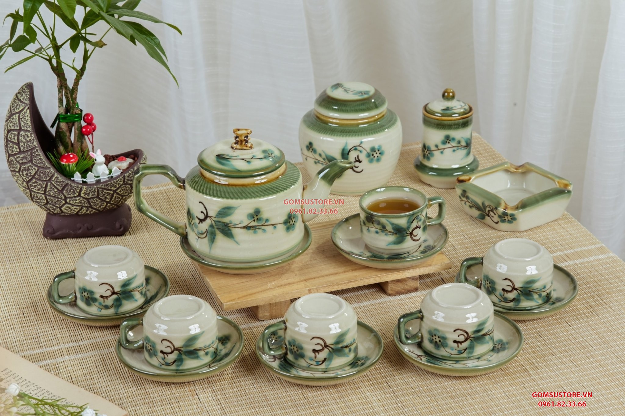Bộ Ấm Chén Pha Uống Trà Bát Tràng Họa Tiết Vẽ Tay – Dáng Ấm Vai Vuông Độc Đáo 500ml