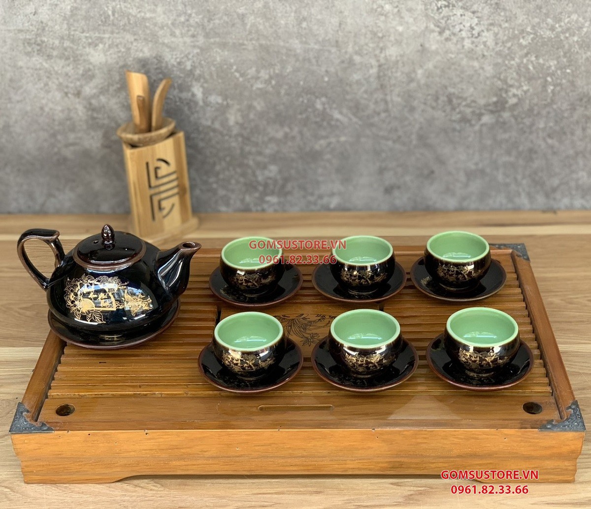 BỘ ẤM TRÀ BÁT TRÀNG CAO CẤP - VINH HOA PHÚ QUÝ MEN ĐEN BÓNG