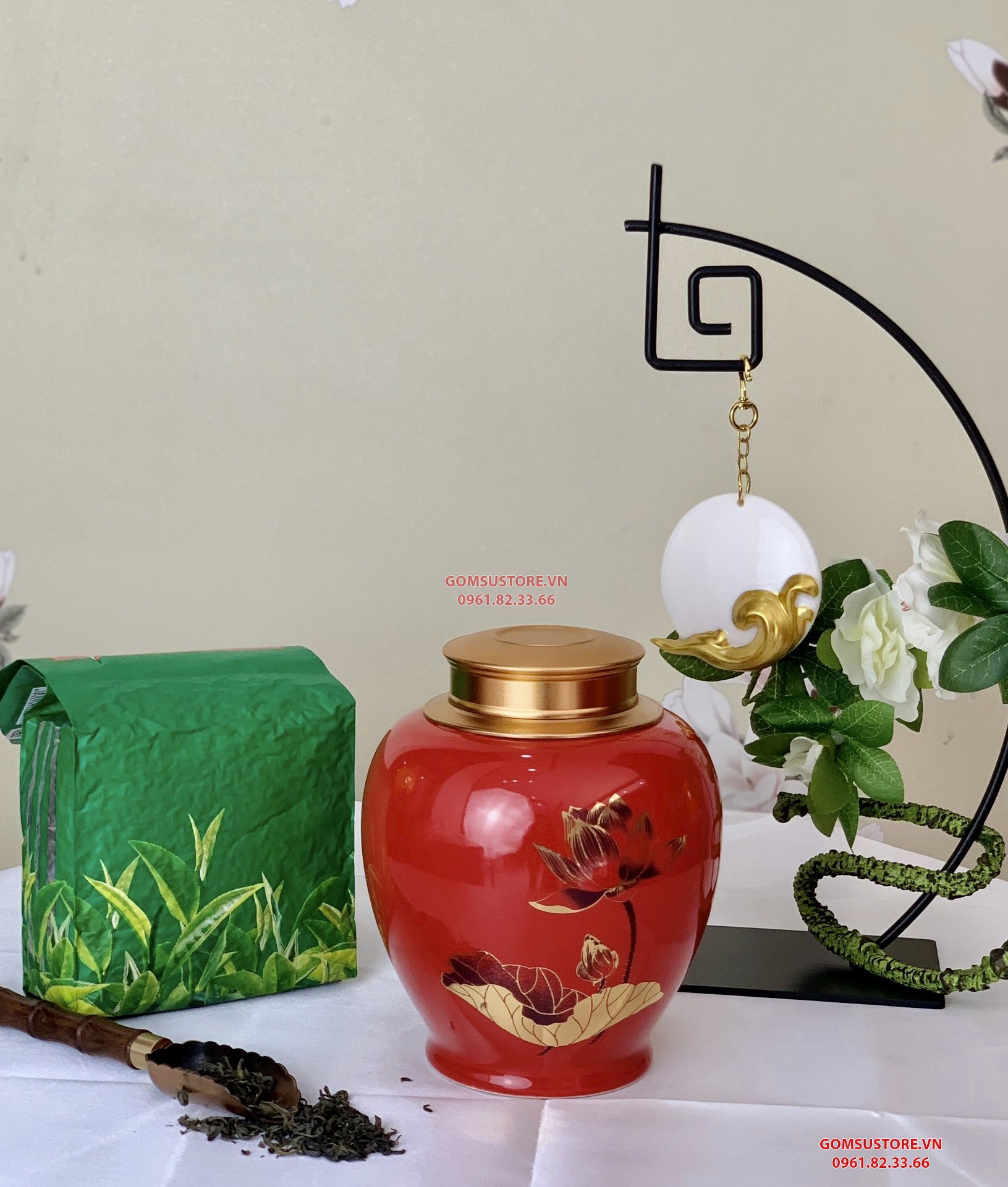 Hũ Đựng chè Vẽ Vàng Màu Đỏ, Lọ đựng Trà Gốm Sứ Bát Tràng Cao Cấp Cao 15 Đường Kính 13