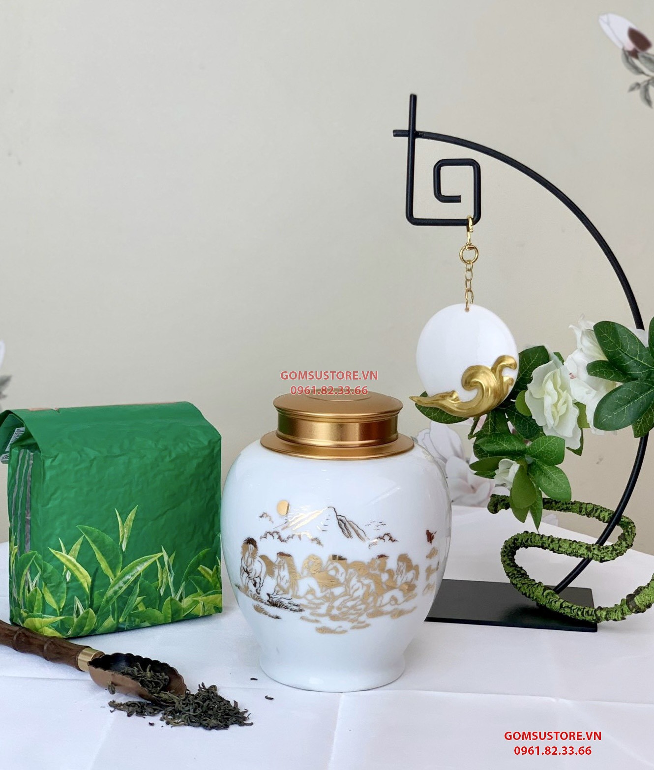 Hũ Đựng chè Vẽ Vàng Mã Đáo Thành Công_Lọ đựng Trà Gốm Sứ Bát Tràng Cao Cấp