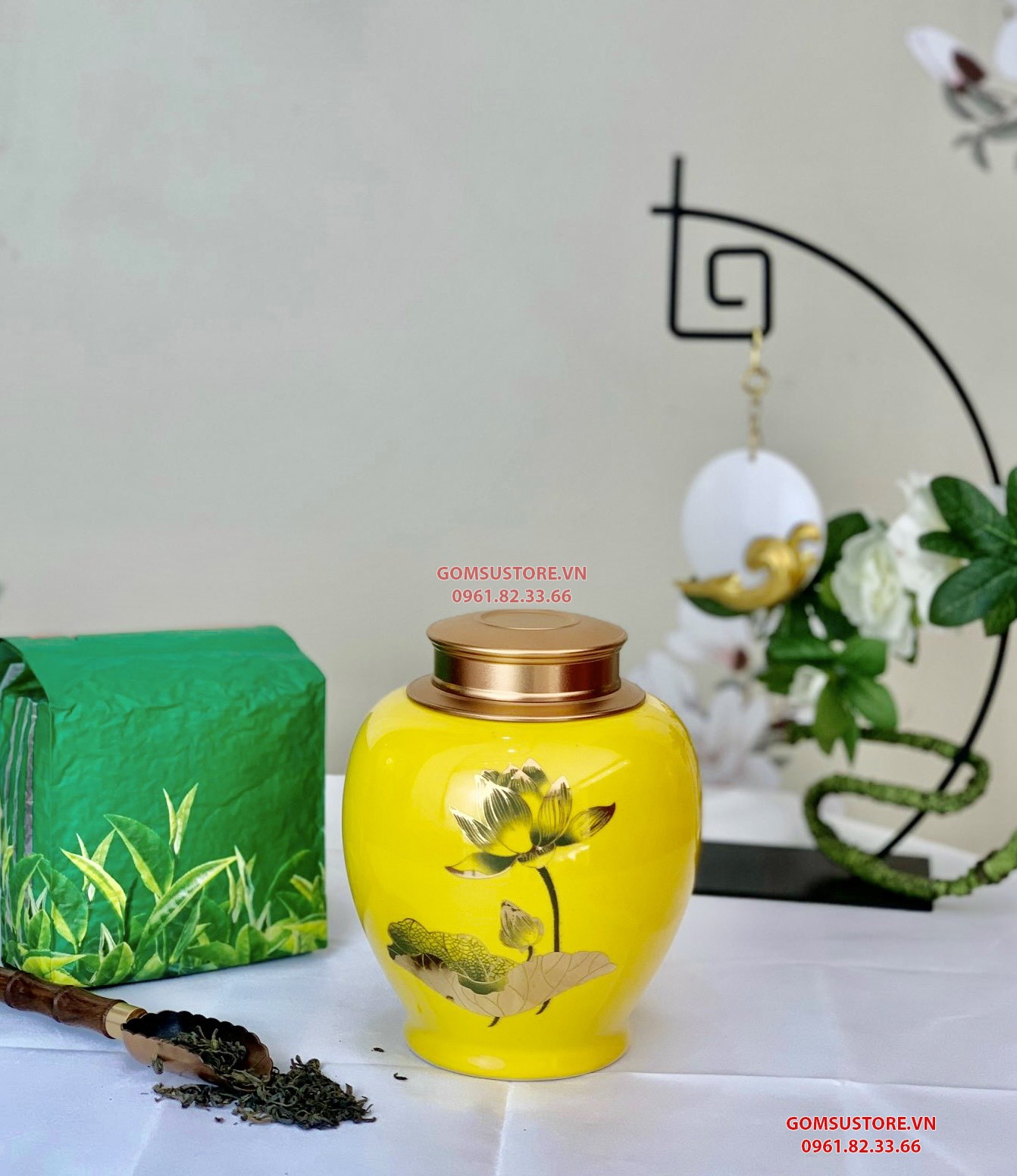 - Hũ đựng trà gốm được vẽ vàng tỉ mỉ chi tiết