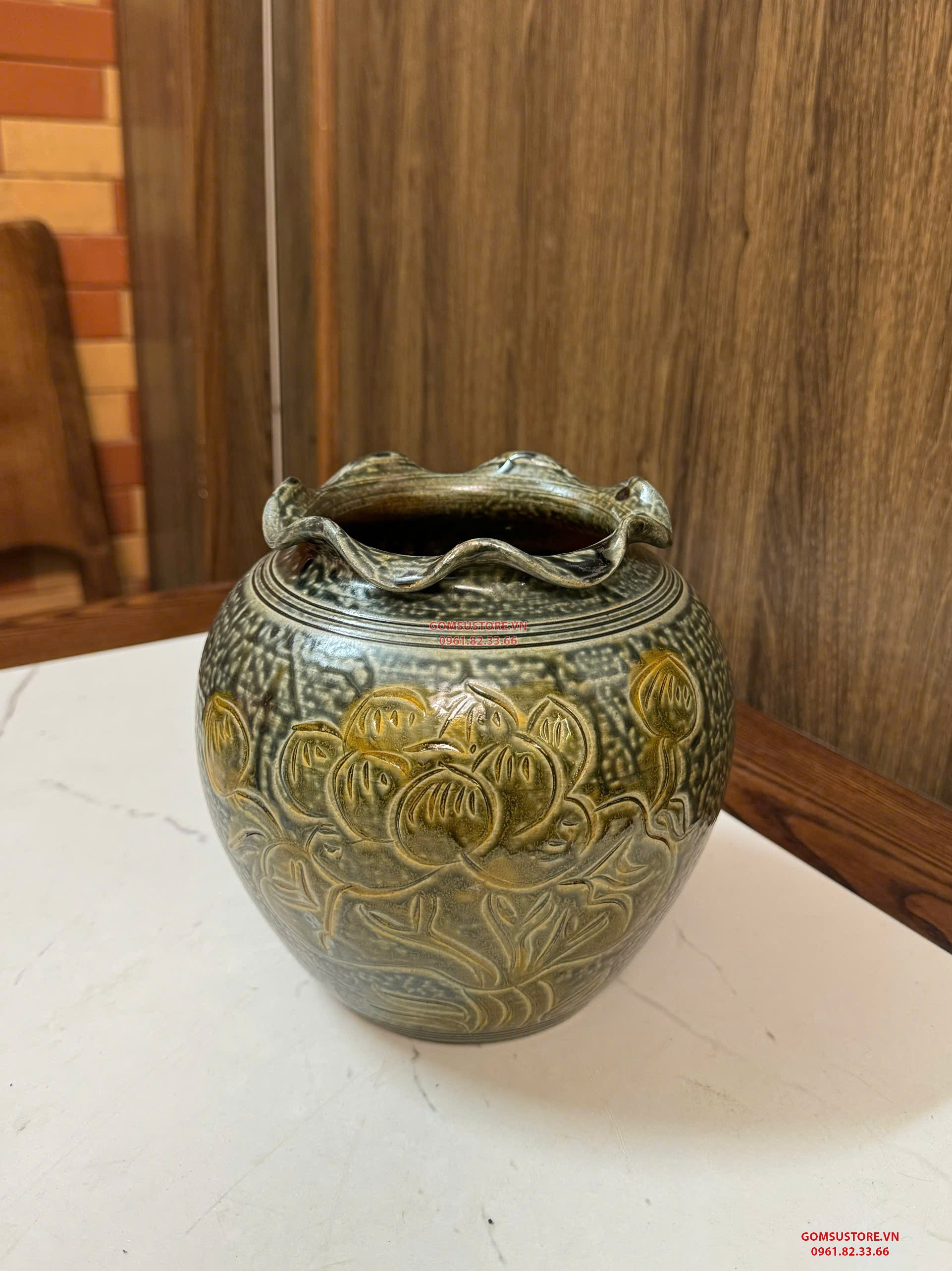 Sản phẩm được chế tác thủ công với lớp men rạn cổ đặc trưng, hoạ tiết hoa sen đắp nổi tỉ mỉ trên 3 mặt, phù hợp trang trí bàn thờ, bàn khách, kệ tủ, quán cà phê, spa hoặc làm quà tặng. Mỗi chiếc lọ đều có dấu in “Bát Tràng” rõ nét dưới đáy, chứng nhận hàng chính gốc.