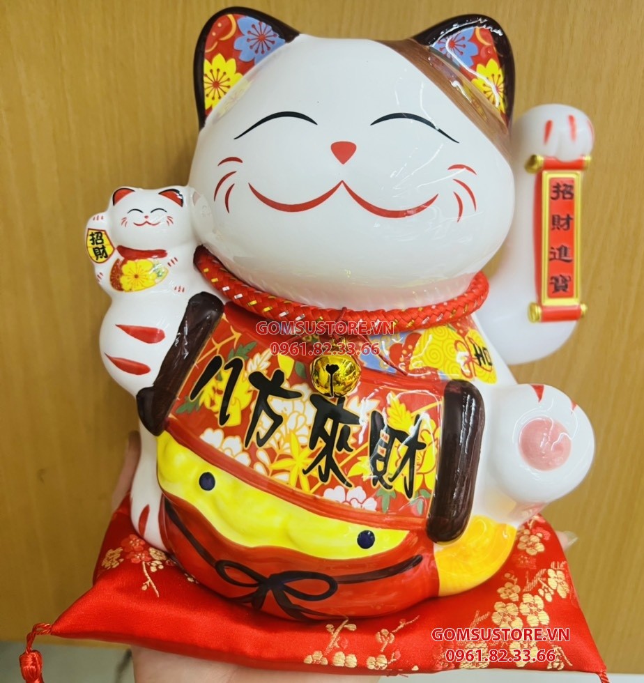 Mèo Thần Tài Vẫy Tay, Mèo May Mắn Maneki Neko bát phương tài lộc 20cm Kèm Đệm Và Hộp Đẹp