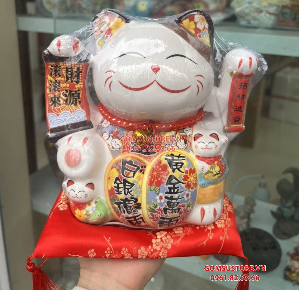 Mèo Thần Tài  Vẫy Tay, Mèo May Mắn Maneki Neko Chiêu tài lộc 20cm Kèm Đệm Và Hộp Đẹp